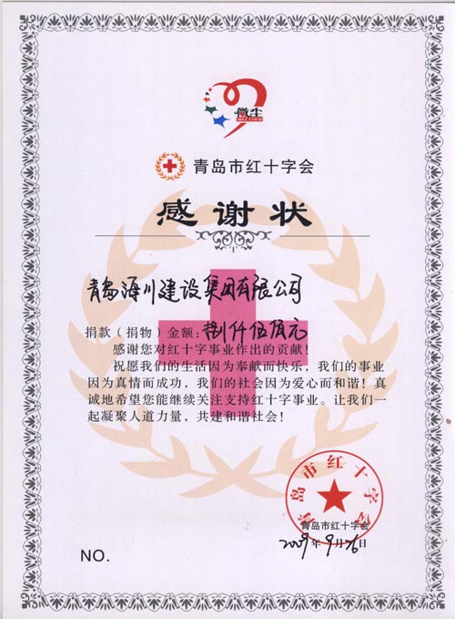 四川抗震救災捐款紅十字感謝狀