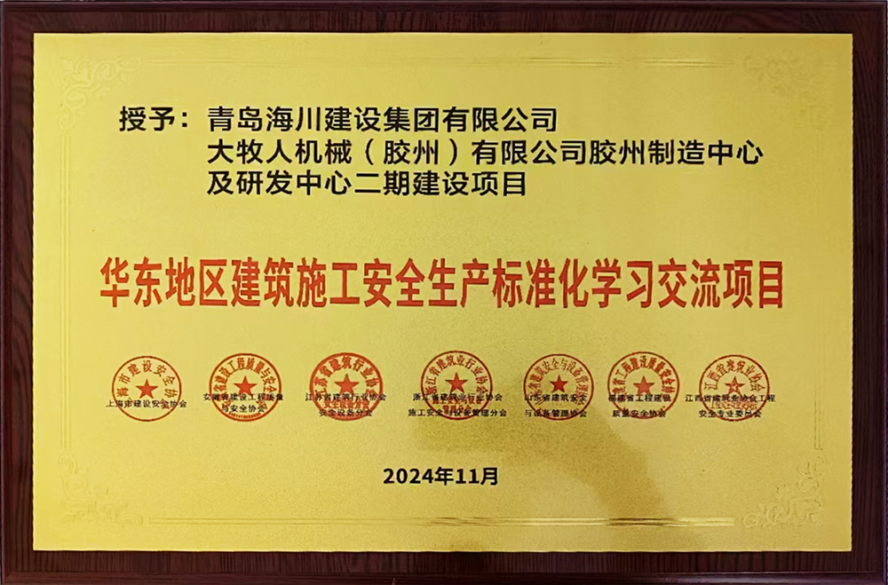 青島海川建設(shè)承建的大牧人項(xiàng)目獲評(píng)“華東地區(qū)建筑施工安全生產(chǎn)標(biāo)準(zhǔn)化學(xué)習(xí)交流項(xiàng)目”2024-11-2911月29日,華東地區(qū)建筑安全聯(lián)席會(huì)公布了2024年度華東六省一市建筑施工安全生產(chǎn)標(biāo)準(zhǔn)化工地學(xué)習(xí)交流活動(dòng)名單,青島海川建設(shè)集團(tuán)承建的大牧人機(jī)械(膠州)有限公司膠州制造中心及研發(fā)中心二期建設(shè)項(xiàng)目工程獲評(píng)“華東地區(qū)建筑施工安全生產(chǎn)標(biāo)準(zhǔn)化學(xué)習(xí)交流項(xiàng)目”。該獎(jiǎng)項(xiàng)由華東地區(qū)各省、... -