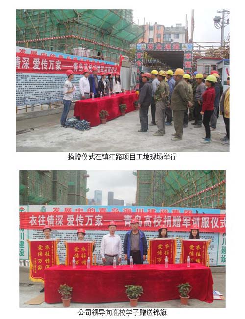 10月16日下午,由青島理工大學(xué)土木學(xué)院學(xué)生會(huì)牽頭組織,青島大學(xué)和中國海洋大學(xué)共同參加的“衣往情深,愛傳萬家”軍訓(xùn)服捐贈(zèng)儀式,在青島海川建設(shè)集團(tuán)鎮(zhèn)江路項(xiàng)目工地隆重舉行。來自青島理工大學(xué)市北校區(qū)、黃島校區(qū),青島大學(xué)和中國海洋大學(xué)的學(xué)生組織代表出席了捐贈(zèng)儀式,青島海川建設(shè)集團(tuán)副總裁李尊強(qiáng)、團(tuán)委書記王群、六分公司都市逸品項(xiàng)目部經(jīng)理劉峰官以及所在項(xiàng)目部分工人代表出席了捐贈(zèng)儀式。