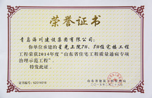 公司最近從省建筑工程管理局接連捧回四項省級榮譽證書,分別是:一分公司中創(chuàng)大廈工程榮獲“2014年度山東省建筑工程優(yōu)質(zhì)結(jié)構(gòu)杯獎”,四分公司星光上院7#、8#住宅樓工程榮獲“2014年度山東省住宅工程質(zhì)量通病專項治理示范工程”。七分公司青島農(nóng)業(yè)大學(xué)新建科技實驗樓工程接連榮獲“2014年度山東省建筑施工安全文明標準化優(yōu)良工地”和 “2014年度山東省建筑工程優(yōu)質(zhì)結(jié)構(gòu)杯獎”兩項榮譽。