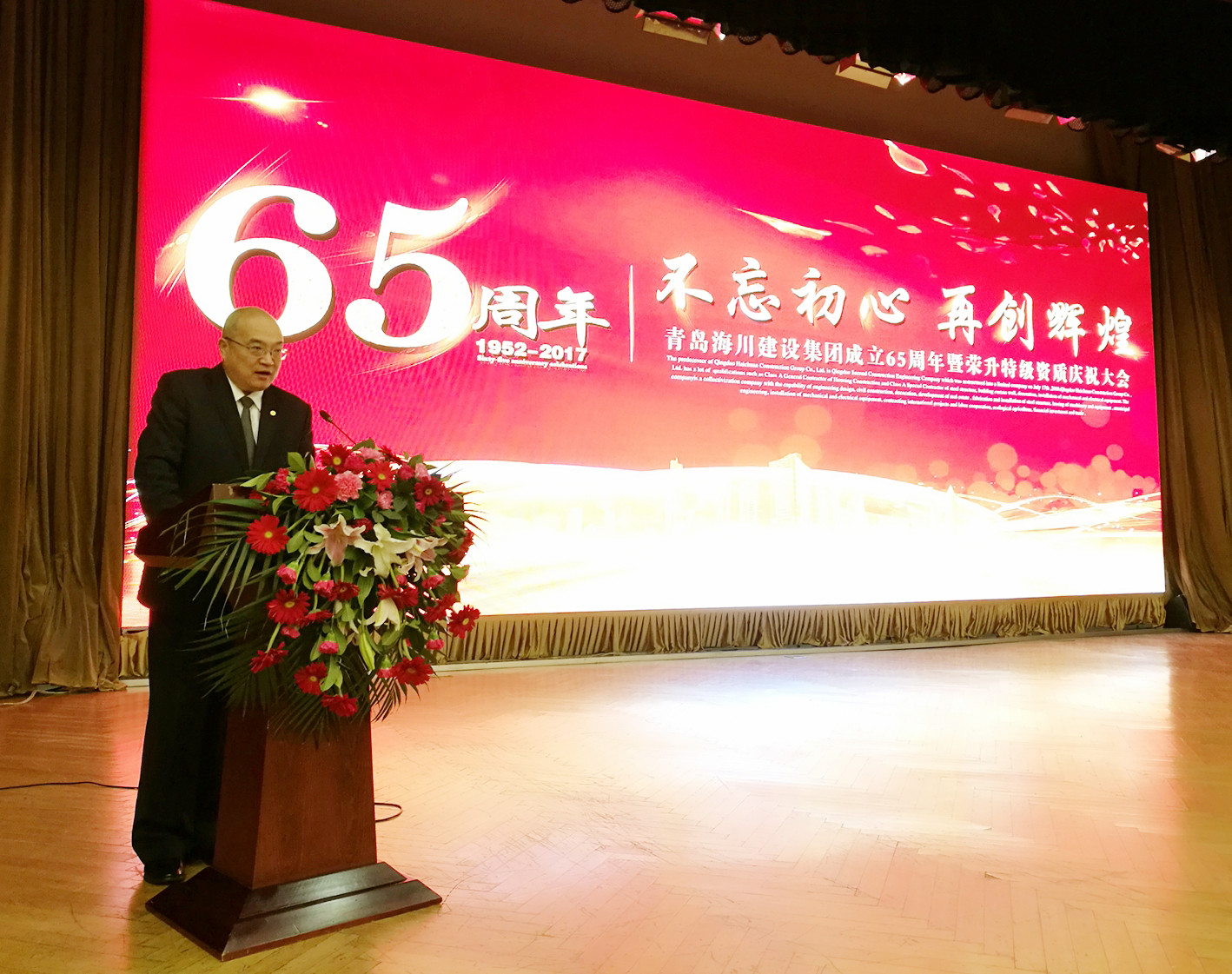 2017年12月29日上午,青島海川建設(shè)集團(tuán)成立65周年暨榮升特級(jí)資質(zhì)慶祝大會(huì)在黃海飯店隆重舉行。蒞臨現(xiàn)場(chǎng)的嘉賓有:原二建公司經(jīng)理陳樹(shù)業(yè)、原二建公司經(jīng)理國(guó)常光、原二建公司經(jīng)理鄭同慶,青島建設(shè)集團(tuán)建興工程有限公司董事長(zhǎng)逄振輝、青建隆泰興業(yè)建設(shè)有限公司總經(jīng)理趙錫業(yè)、青島建設(shè)裝飾集團(tuán)有限公司董事長(zhǎng)張波等領(lǐng)導(dǎo)。海川建設(shè)集團(tuán)董事長(zhǎng)吳鑫、總裁仇建軍和公司股東、理事會(huì)成員、企業(yè)中層管理人員200余人參加,共同見(jiàn)證海川建設(shè)集團(tuán)在改革奮進(jìn)歷程當(dāng)中砥礪前行的輝煌成果。